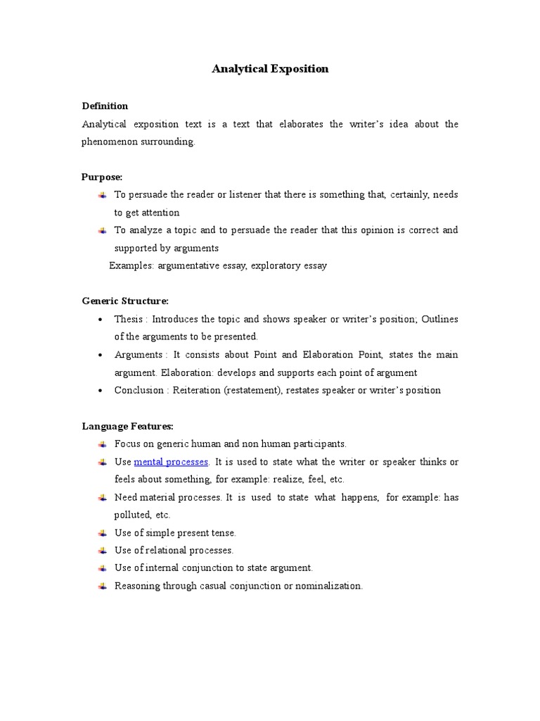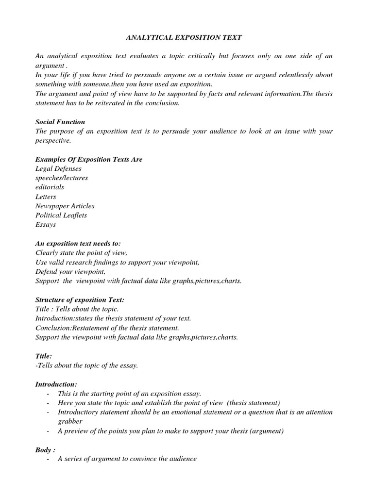 Analytical Exposition Text Example - The Differences Between Analytical Exposition And Hortatory Exposition Understanding Text - The expository essay is a genre of essay that requires the student to investigate an idea, evaluate evidence, expound on the idea, and set forth an argument concerning that idea in a clear and concise manner.